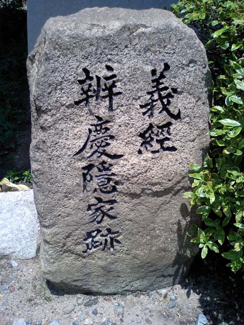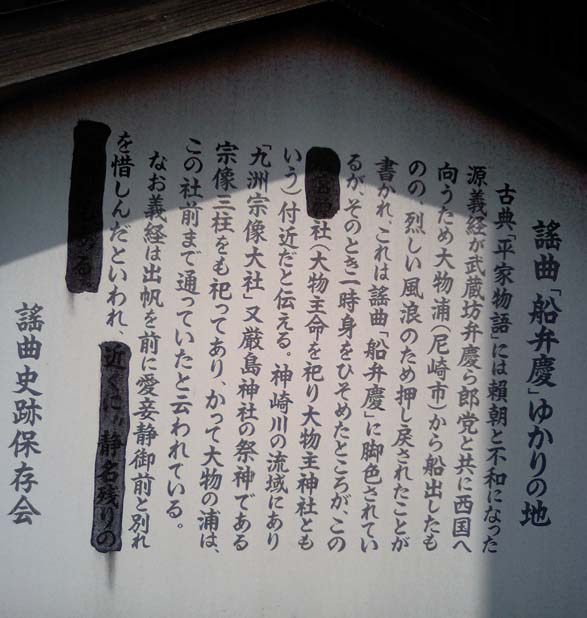 頼朝の追っ手から逃れるために都落ちを決意した義経が、西国を目指して船出した場所といわれているのが大物浦である。町工場が点在する所にひっそりと大物主神社はあった。境内の横には「義経弁慶隠家跡」の碑があり、隣には写真のような説明書きが記されてた。謡曲「船弁慶」では義経、静の別れの場所とされているらしいが、新・平家物語では静も義経主従と一緒に船に乗り込んだと記されている。そのためか単なる落書きか解らないが、黒く塗りつぶされている箇所があった。